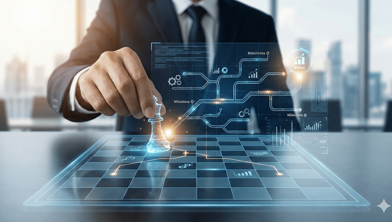 Wir entwickeln eine klare KI-Strategie priorisierte KI-Roadmap, die sich an ihrem Geschäftsmodell orientiert und messbare Wertschöpfung statt Tool-Experimente liefert.